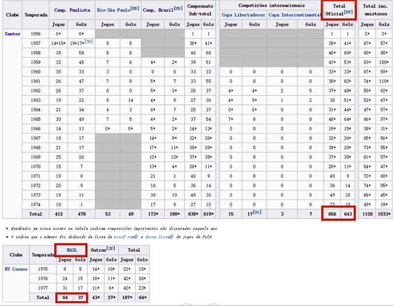 葡萄牙语版维基百科,却给出了另一个数据:排除所有友谊赛和商业赛,贝利为桑托斯正式比赛出场656次,斩获643球;为纽约宇宙正式比赛(联赛)出场64次,贡献37球;再加上巴西国家队的92场77球,合计就是812场,757球。