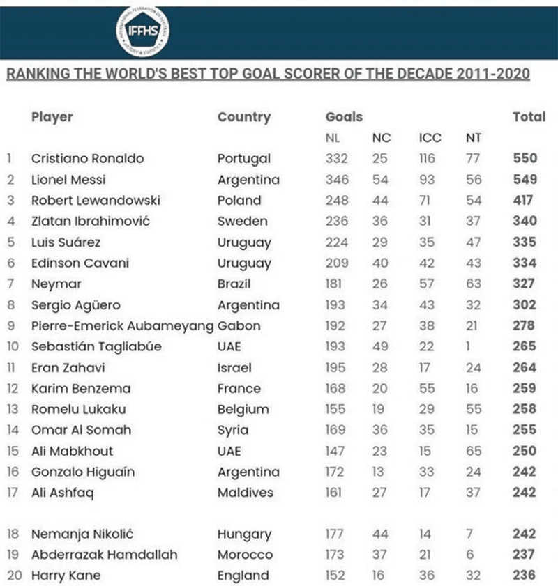 1月4日,IFFHS首先揭晓21世纪前20年最佳射手奖项,C罗以756球(目前为758球)赢得这一奖项,排名其后的分别是梅西(715球)、伊布(558球)、苏亚雷斯(489球)和莱万(473球)。在21世纪,共有33位球员的进球数超过了300球,此外还有16名球员在20、21世纪的进球数达到了300球。