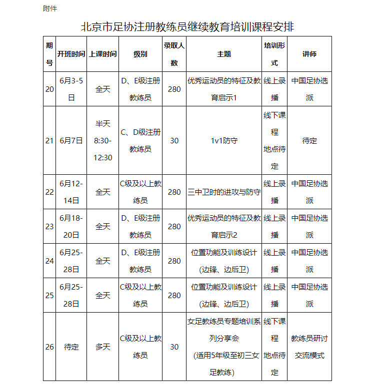 为贯彻落实《北京市足球改革发展总体方案》,加大足球教练员培养力度,推进基础培训和继续教育,北京市足协将于2021年6月3日至28日举办七期教练员继续教育培训班。