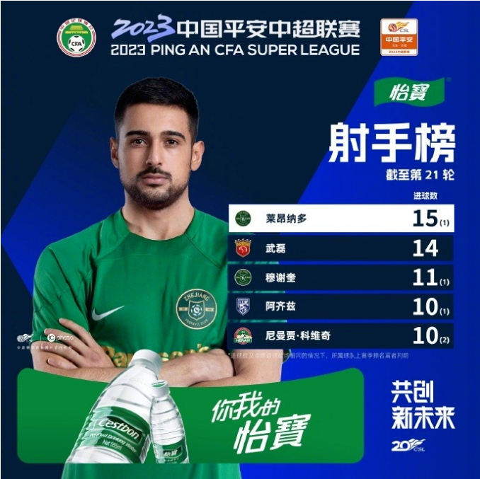 中超联赛官方公布了截至第21轮射手榜,莱昂纳多继续以15球领跑,武磊以一球之差紧随其后。
